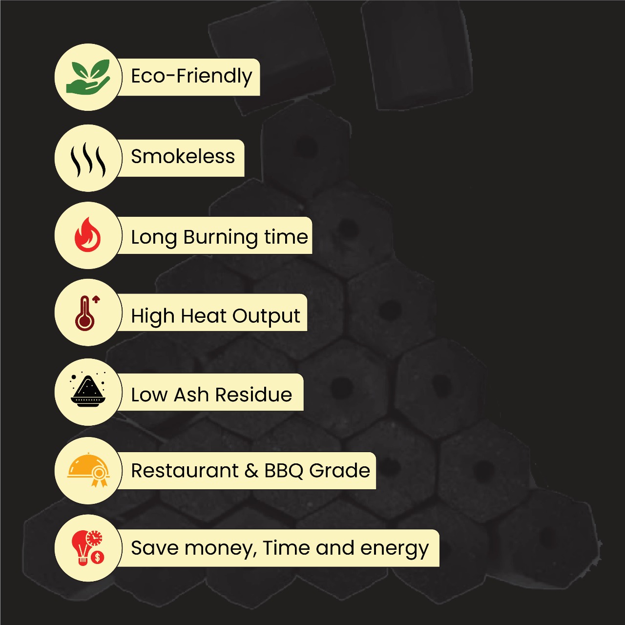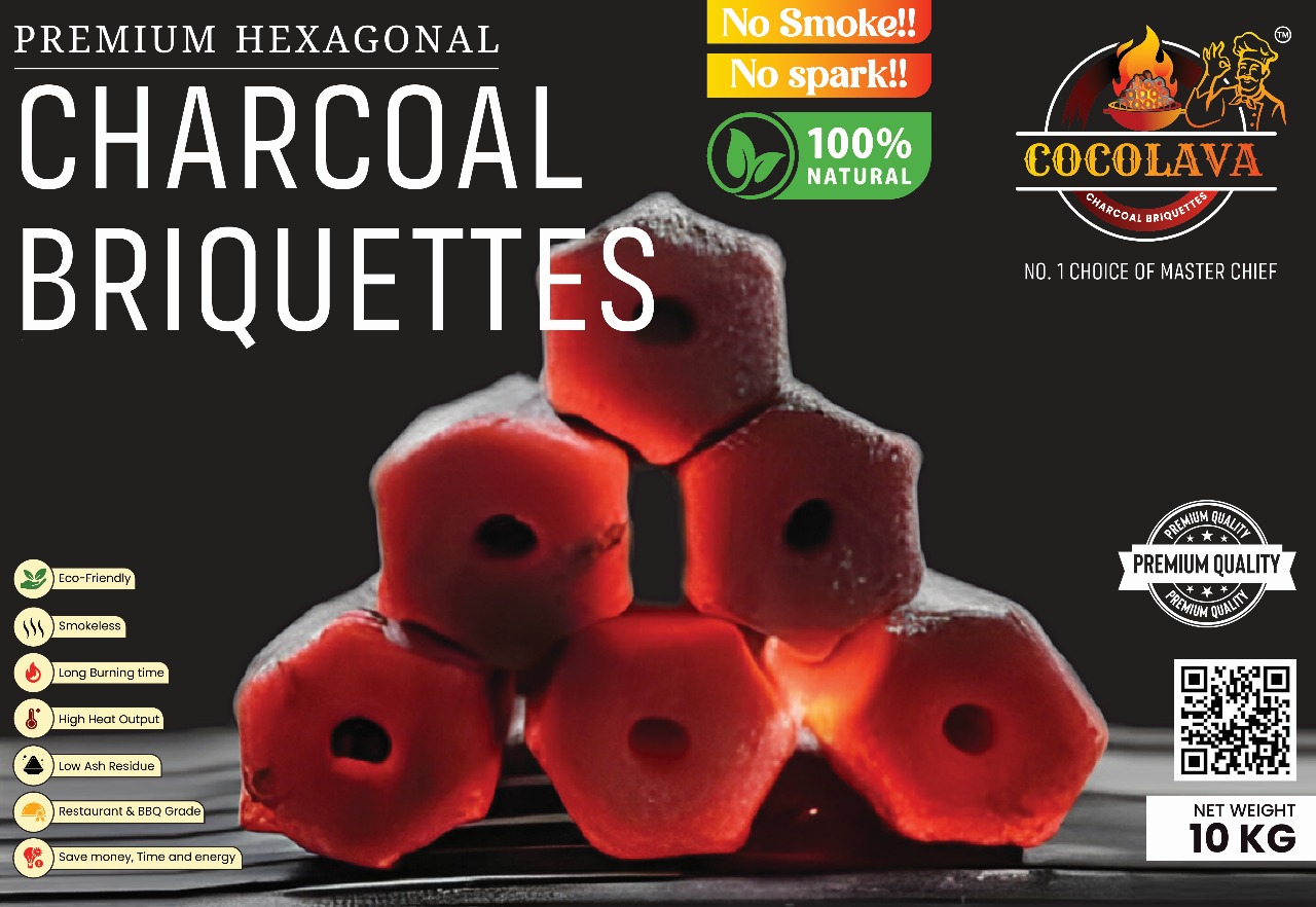 Discover premium hexagonal charcoal briquettes — No Smoke, No Spark — perfect for restaurants and BBQ events across India.